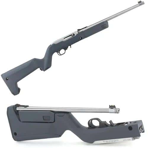 Features a Magpul® X-22 Backpacker stock with an ergonomic handguard, optional QD sling mounting capability, integrated storage compartment in the grip, a hinged storage compartment in the stock capable of storing up to three spare 10-round magazines, an MOE SL® non-slip rubber buttpad, and a unique locking interface to attach the barrel assembly to the receiver when being transported.